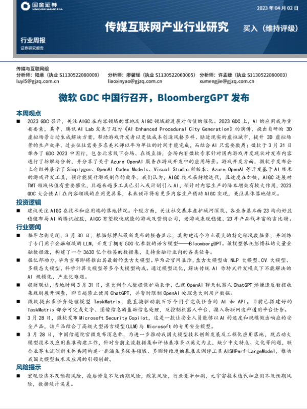 【国金证券】【20230402】微软GDC中国行召开,BloombergGPT发布-20页 行业研究