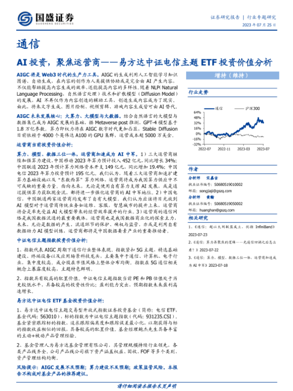 【国盛证券】【20230725】AI投资,聚焦运营商——易方达中证电信主题ETF投资价值分析-15页 行业研究