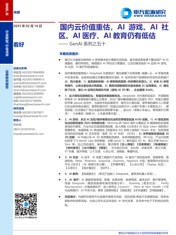 【申万宏源】【20250216】传媒行业GenAI系列之五十:国内云价值重估,AI游戏、AI社区、AI医疗、AI教育仍有低估-21页 行业研究
