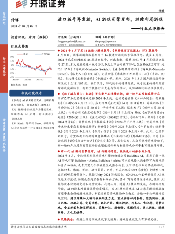 【开源证券】【20240409】传媒行业点评报告:进口版号再发放,AI游戏引擎发布,继续布局游戏-3页 行业研究