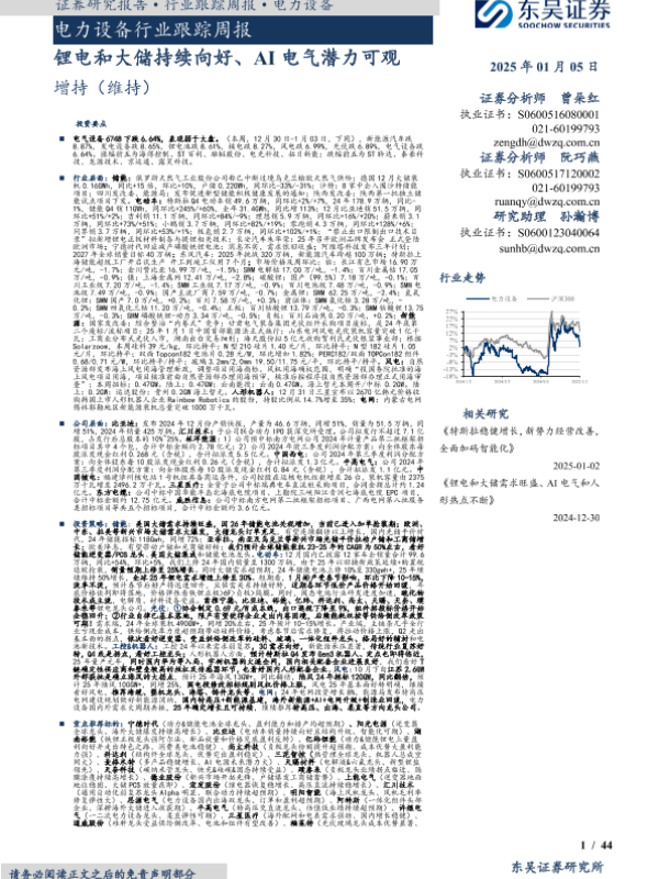 【东吴证券】【20250105】电力设备行业跟踪周报:锂电和大储持续向好、AI电气潜力可观-44页 行业研究
