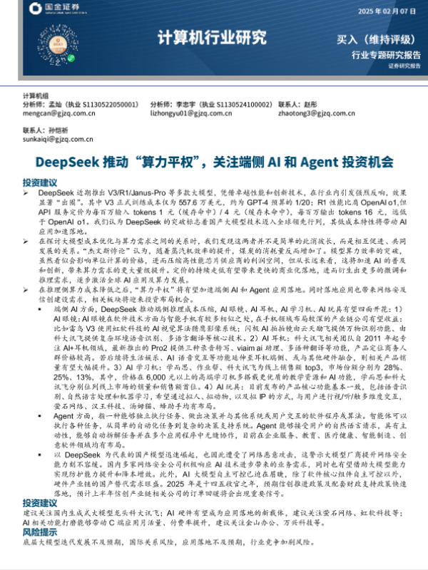 【国金证券】【20250210】计算机行业研究:DeepSeek推动“算力平权”,关注端侧AI和Agent投资机会-20页 行业研究