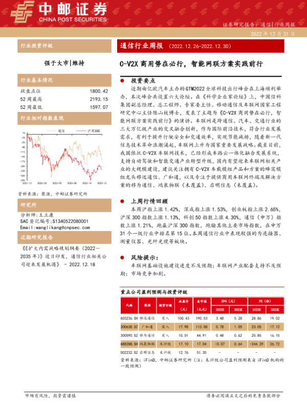 【中邮证券】【20221231】通信行业周报:C-V2X商用势在必行,智能网联方案实践前行-24页 行业研究
