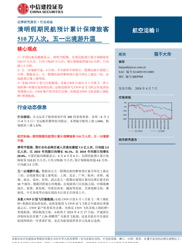 【中信建投证券】【20240407】航空运输行业动态:清明假期民航预计累计保障旅客510万人次,五一出境游升温-24页 行业研究