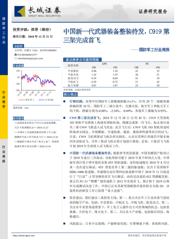 【长城证券】【20181231】20181231-长城证券-国防军工行业周报:中国新一代武器装备整装待发,C919第三架完成首飞-16页 行业研究
