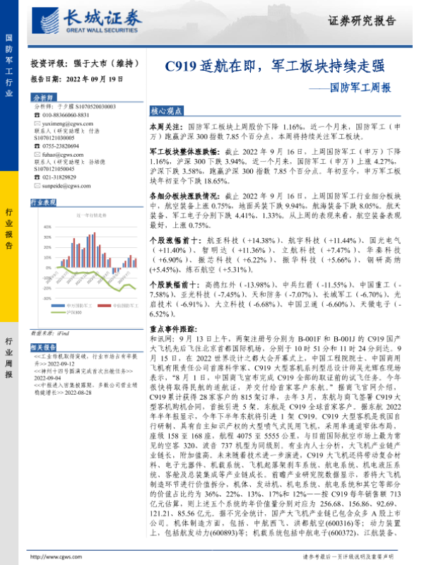 【长城证券】【20220919】20220919-长城证券-国防军工周报:C919适航在即,军工板块持续走强-15页 行业研究