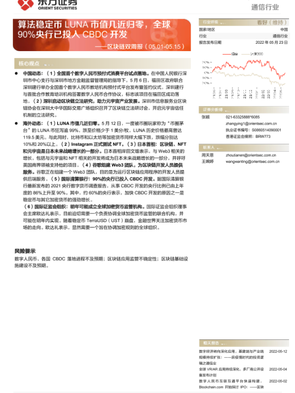 【东方证券】【20220523】通信行业周报:区块链双周报-算法稳定币LUNA市值几近归零,全球90%央行已投入CBDC开发-10页 行业研究