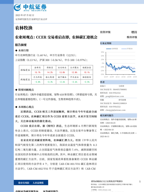 【中航证券】【20230702】农业周观点:CCER交易重启在即,农林碳汇迎机会-14页 行业研究