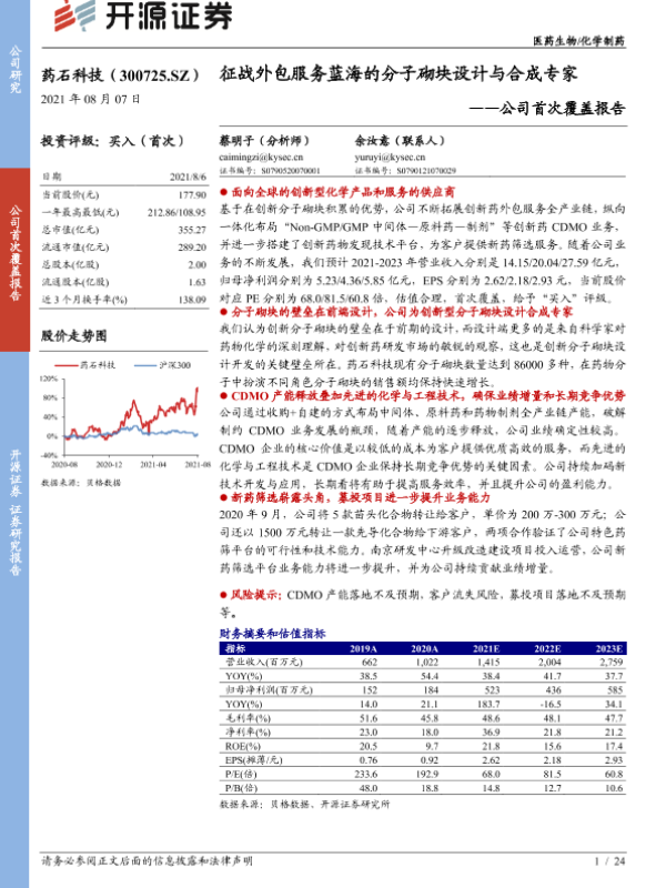 【开源证券】【20210807】药石科技-300725.SZ-公司首次覆盖报告:征战外包服务蓝海的分子砌块设计与合成专家-24页 证券期货研究报告