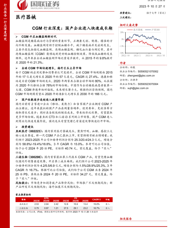 【国联证券】【20231027】医疗器械-CGM行业深度:国产企业进入快速成长期-27页 行业研究