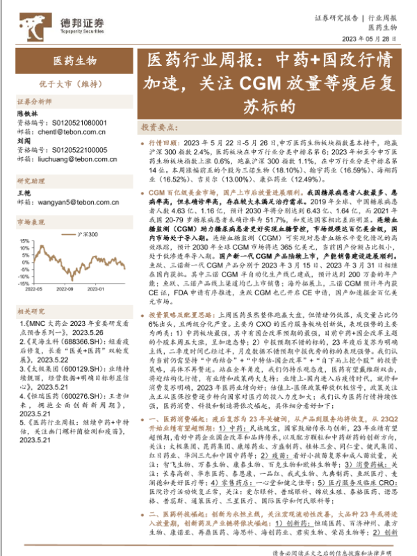 【德邦证券】【20230528】医药行业周报:中药+国改行情加速,关注CGM放量等疫后复苏标的-22页 行业研究