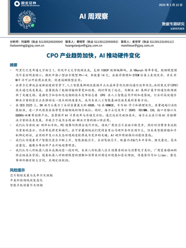 【国金证券】【20250112】Al周观察:CPO产业趋势加快,AI推动硬件变化-13页 行业研究