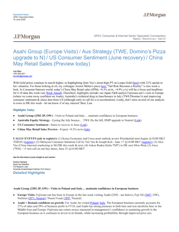 【J.P. Morgan】【20250616】朝日集团(欧洲访问)_澳大利亚策略(TWE,达美乐披萨评级上调至中性)_美国消费者信心(6月复苏)_中国5月零售销售(今日预览)-8页 行业研究
