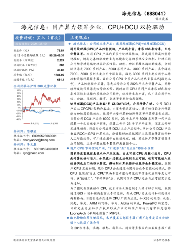 【华安证券】【20240819】海光信息(688041)首次覆盖:国产算力领军企业,CPU+DCU双轮驱动-30页 行业研究