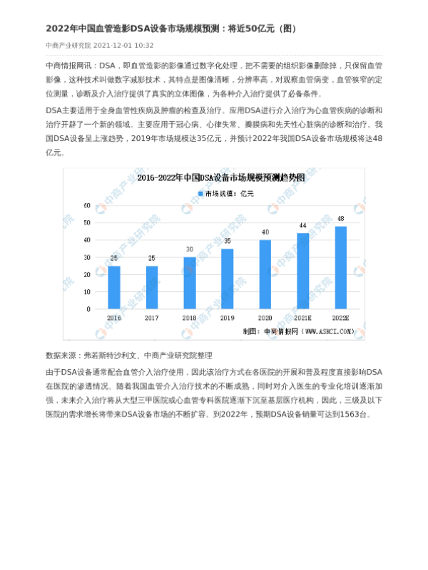 【中商产业研究院】【20211201】2022年中国血管造影DSA设备市场规模预测:将近50亿元-2页 行业研究