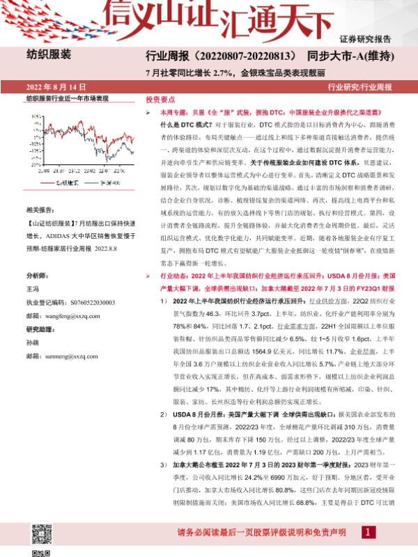 【山西证券】【20220814】纺织服装行业周报:7月社零同比增长2.7%,金银珠宝品类表现靓丽-22页 行业研究