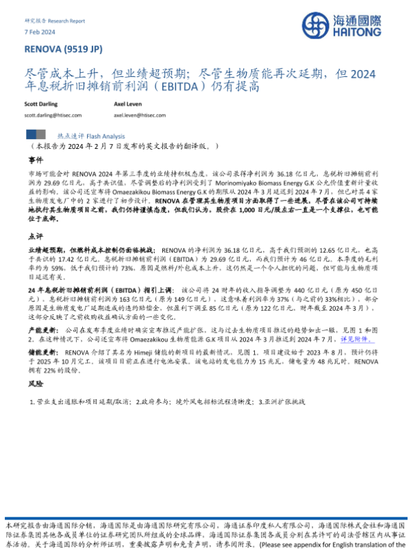 【海通国际】【20240207】尽管成本上升,但业绩超预期;尽管生物质能再次延期,但2024年息税折旧摊销前利润(EBITDA)仍有提高-10页 行业研究