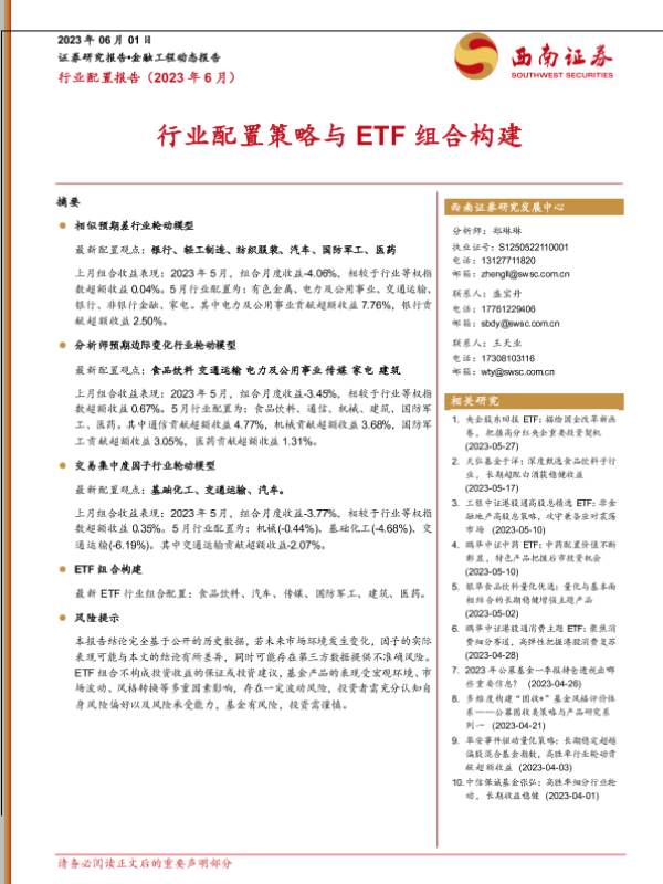 【西南证券】【20230601】行业配置报告(2023年6月):行业配置策略与ETF组合构建-15页 行业研究