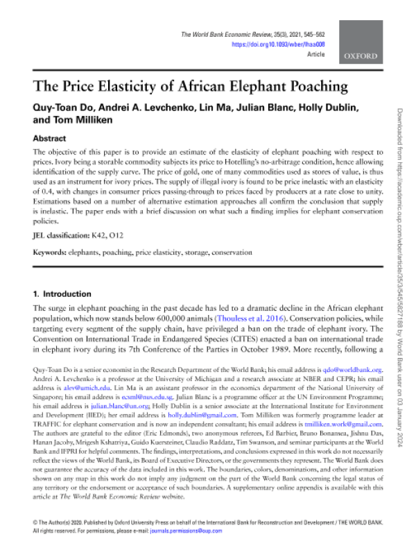 【The World Bank】【2021】The Price Elasticity of African Elephant Poaching-18页 学术论文