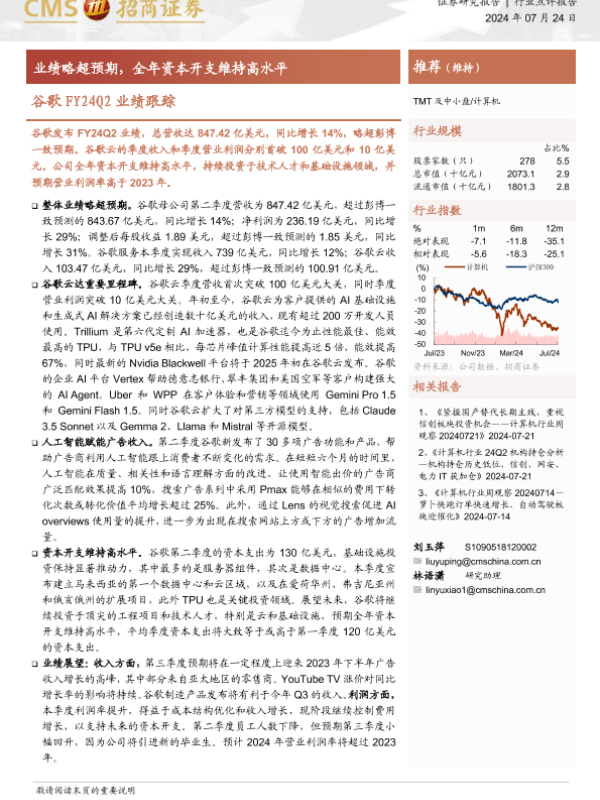 【海通证券】【20240724】谷歌FY24Q2业绩跟踪:业绩略超预期,全年资本开支维持高水平-17页 财报