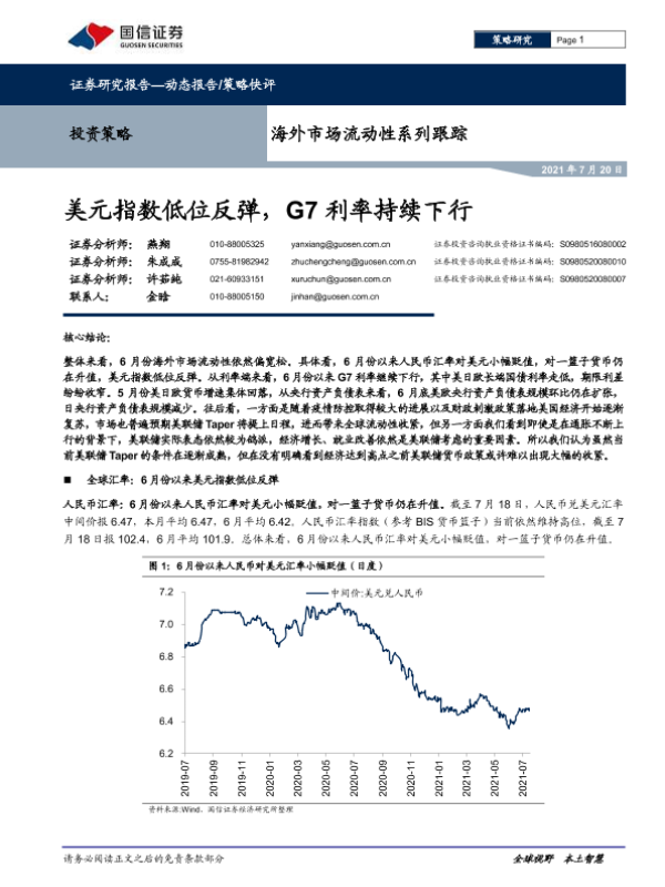【国信证券】【20210720】海外市场流动性系列跟踪:美元指数低位反弹,G7利率持续下行-11页 行业研究