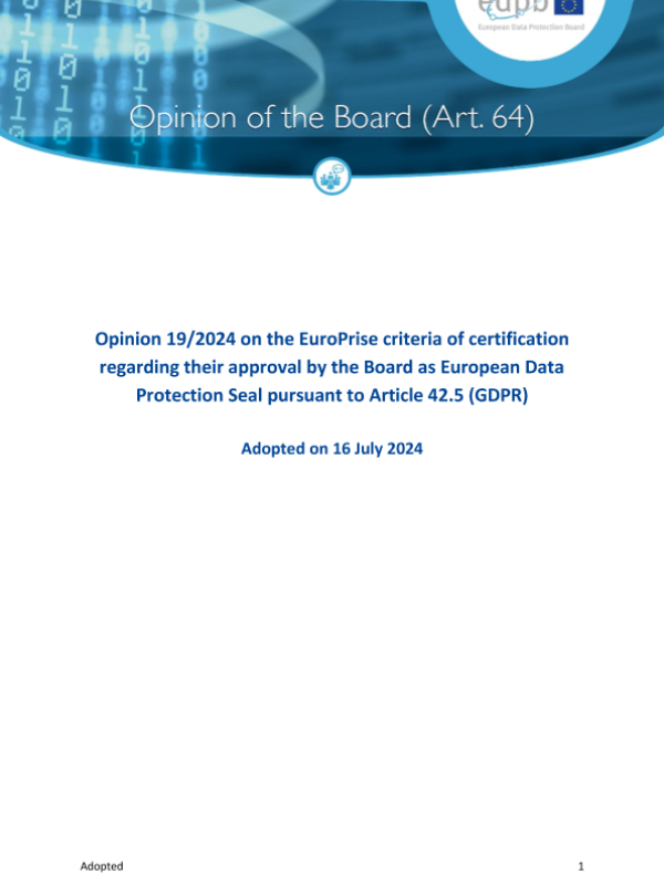 【European Data Protection Board】【20240716】Opinion 19/2024 on the EuroPrise criteria of certification regarding their approval by the Board as European Data Protection Seal-7页 政策文件