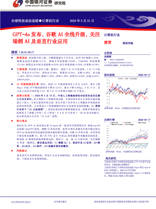 【银河证券】【20240521】计算机行业全球科技动态追踪:GPT-4o发布,谷歌AI全线升级,关注端侧AI及垂直行业应用-12页 行业研究