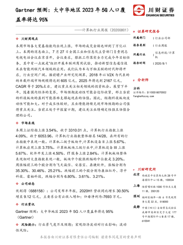 【川财证券】【20200801】20200801-川财证券-计算机行业周报:Gartner预测:大中华地区2023年5G人口覆盖率将达95%-8页 行业研究