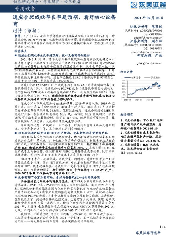 【东吴证券】【20210406】专用设备:通威合肥线效率良率超预期,看好核心设备商-4页 行业研究