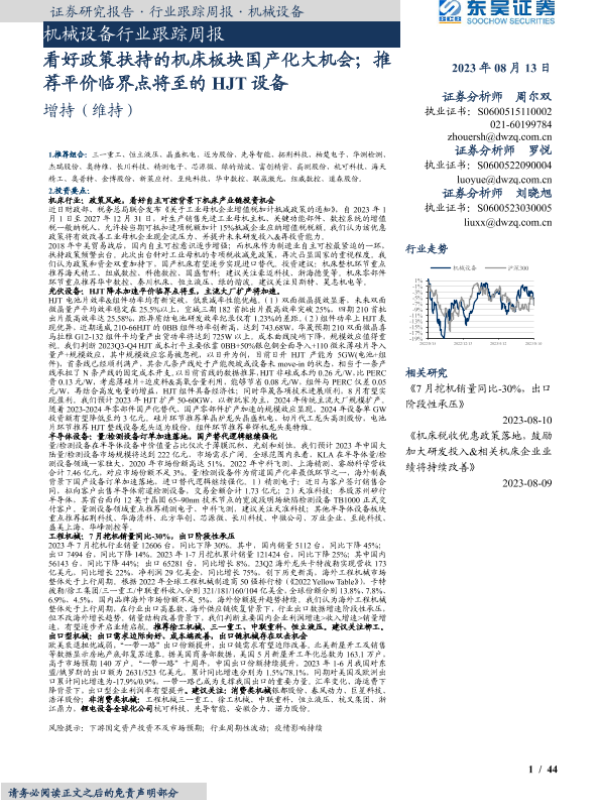 【东吴证券】【20230813】20230813-东吴证券-机械设备行业跟踪周报:看好政策扶持的机床板块国产化大机会;推荐平价临界点将至的HJT设备-44页 行业研究