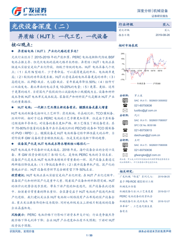 【广发证券】【20190826】光伏设备深度(二):异质结(HJT):一代工艺,一代设备-33页 行业研究