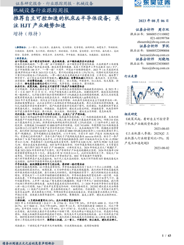 【东吴证券】【20230806】20230806-东吴证券-机械设备行业跟踪周报:推荐自主可控加速的机床&半导体设备;关注HJT产业趋势加速-43页 行业研究