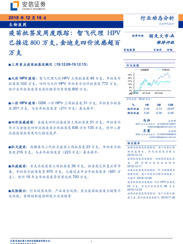 【安信证券】【20191218】疫苗批签发周度跟踪:智飞代理HPV已接近800万支,金迪克四价流感超百万支-13页 行业研究