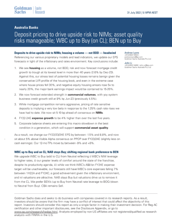 【Goldman Sachs】【20220731】o NIMs; asset quality risks manageable; WBC up to Buy (on CL); BEN up-29页 行业研究