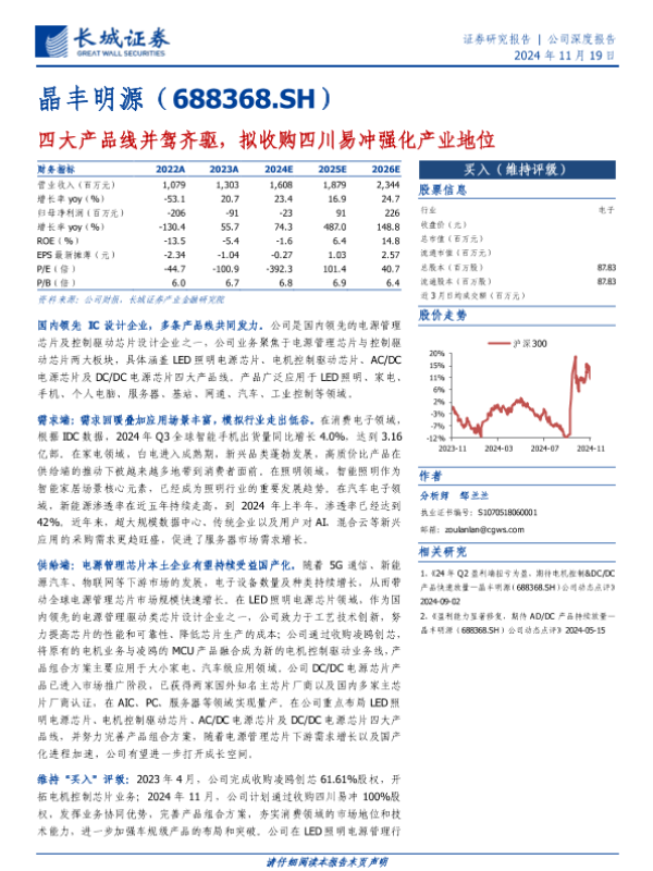 【长城证券】【20241119】晶丰明源-四大产品线并驾齐驱,拟收购四川易冲强化产业地位-28页 行业研究
