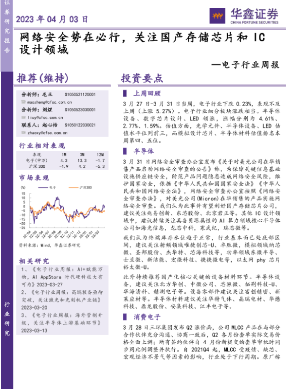 【华鑫证券】【20230403】20230403-华鑫证券-电子行业周报:网络安全势在必行,关注国产存储芯片和IC设计领域-49页 行业研究