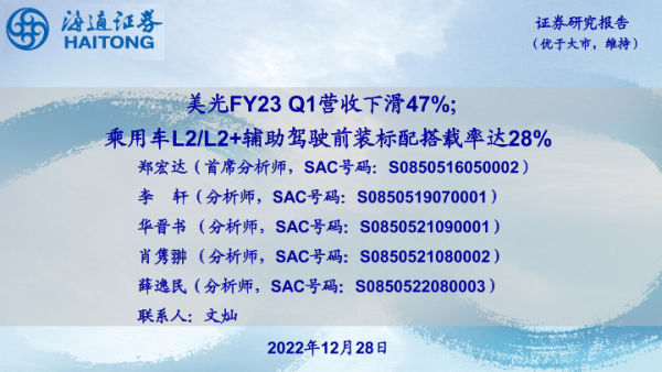 【海通证券】【20221228】电子:美光FY23Q1营收下滑47%;乘用车L2 L2+辅助驾驶前装标配搭载率达28%-10页 行业研究
