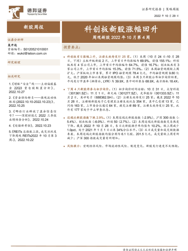 【德邦证券】【20221029】周观新股2022年10月第4周:科创板新股涨幅回升-17页 行业研究