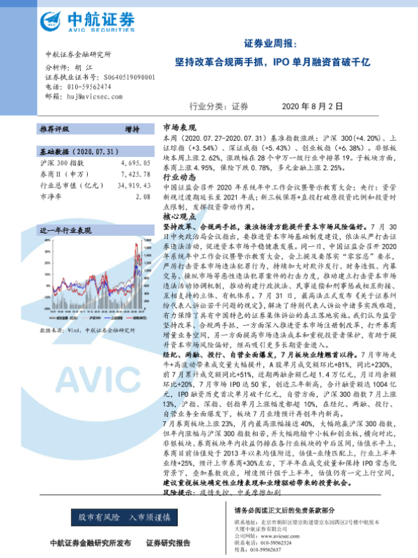 【中航证券】【20200802】证券业周报:坚持改革合规两手抓,IPO单月融资首破千亿-12页 行业研究