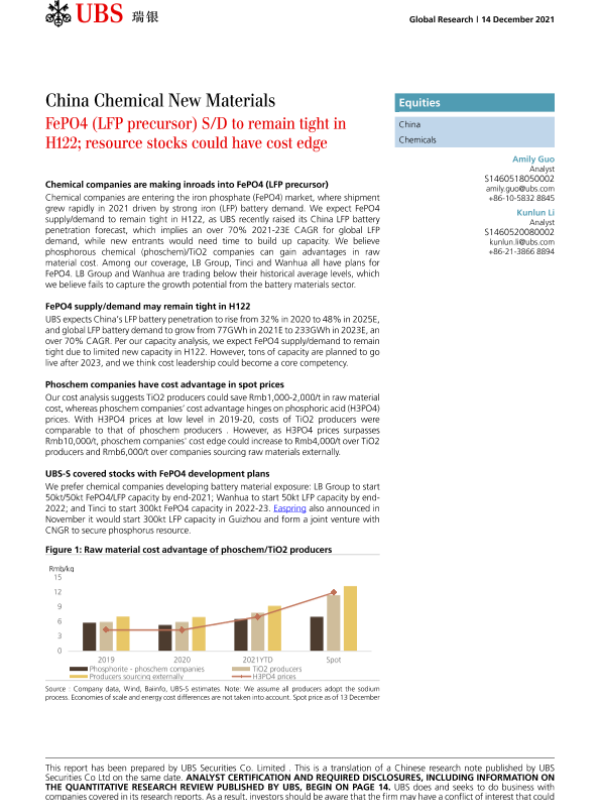 【瑞银】【20211214】瑞银-中国化学制品行业-FePO4(LFP前体)SD在2022年上半年中保持紧密;资源存量可能具有成本优势-23页 行业研究