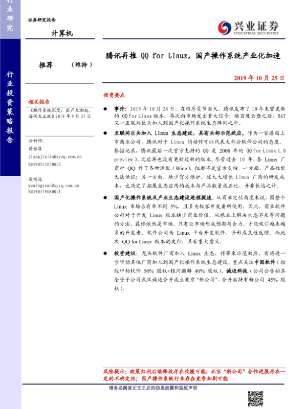 【兴业证券】【20191025】腾讯再推QQ for Linux,国产操作系统产业化加速-5页 行业研究