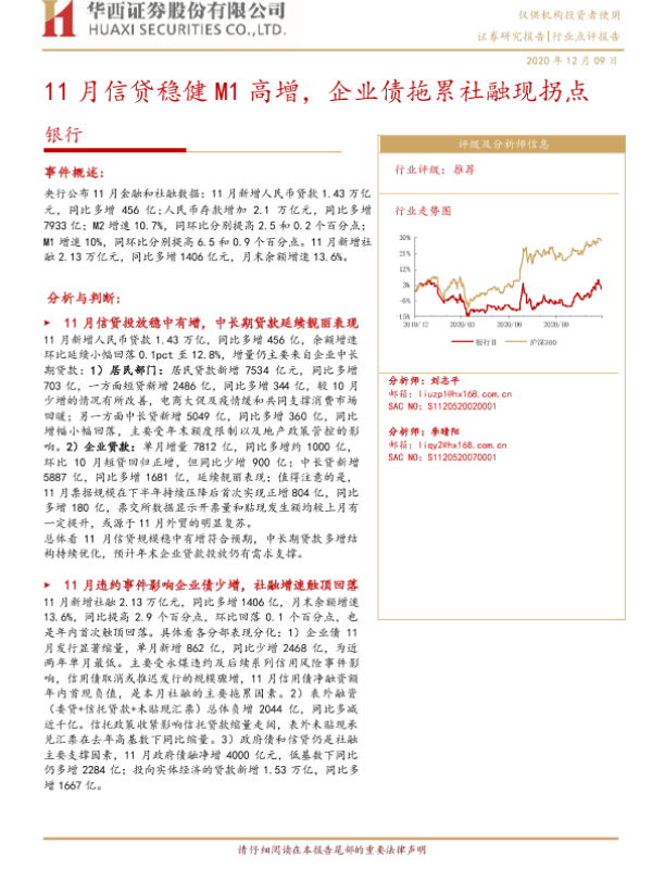 【华西证券】【20201209】11月信贷稳健M1高增,企业债拖累社融现拐点-4页 行业研究