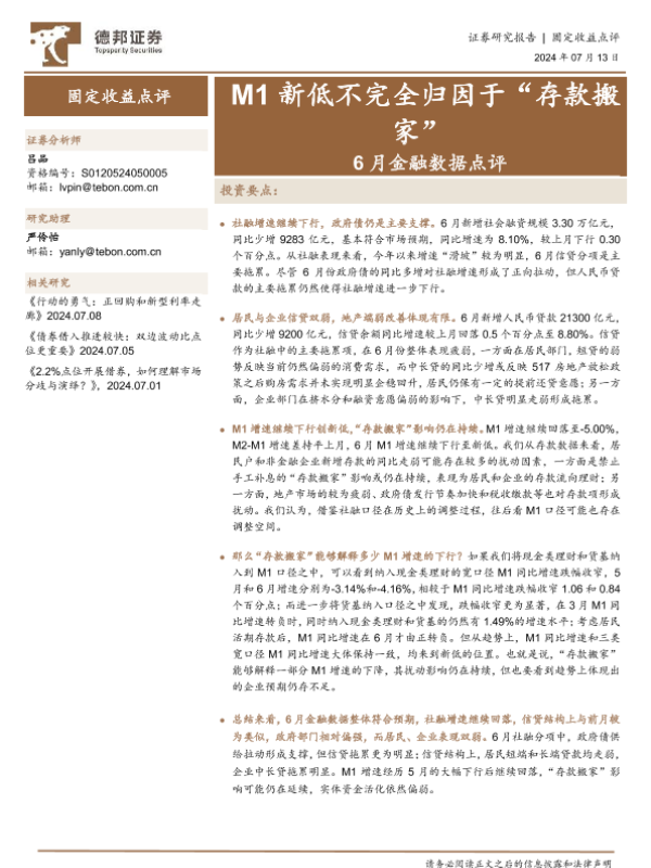 【德邦证券】【20240713】6月金融数据点评:M1新低不完全归因于“存款搬家”-11页 行业研究