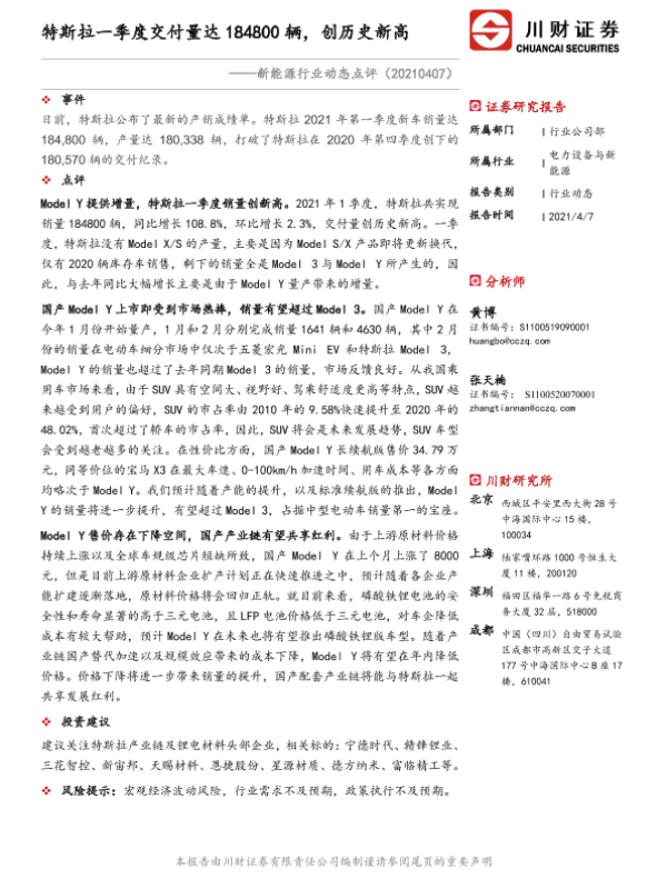 【川财证券】【20210407】新能源行业动态点评:特斯拉一季度交付量达184800辆,创历史新高-2页 证券期货研究报告