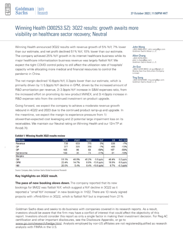 【Goldman Sachs】【20221027】Winning Health 3Q22 results growth awaits more visibility on healthcare sector recovery; Neutral-8页 行业研究