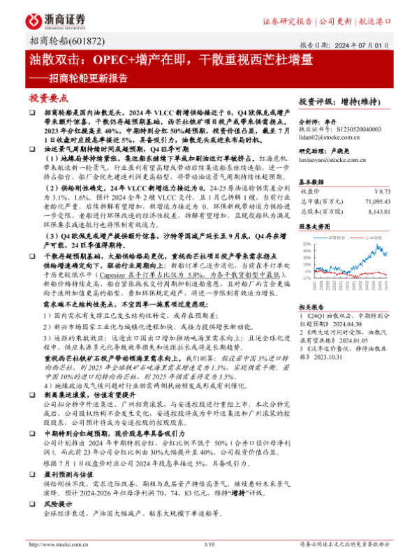 【浙商证券】【20240701】招商轮船(601872)更新报告:油散双击:OPEC+增产在即,干散重视西芒杜增量-10页 行业研究