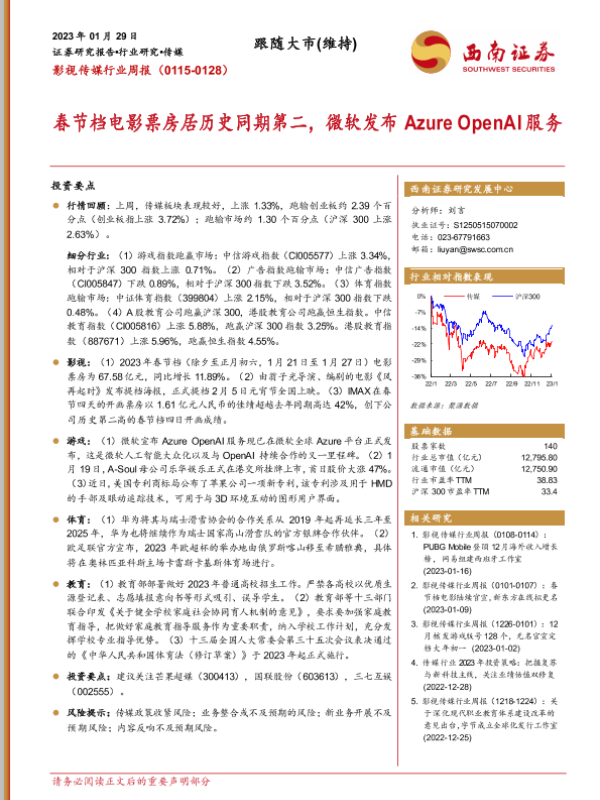 【西南证券】【20230129】影视传媒行业周报:春节档电影票房居历史同期第二,微软发布Azure OpenAI服务-19页 行业研究