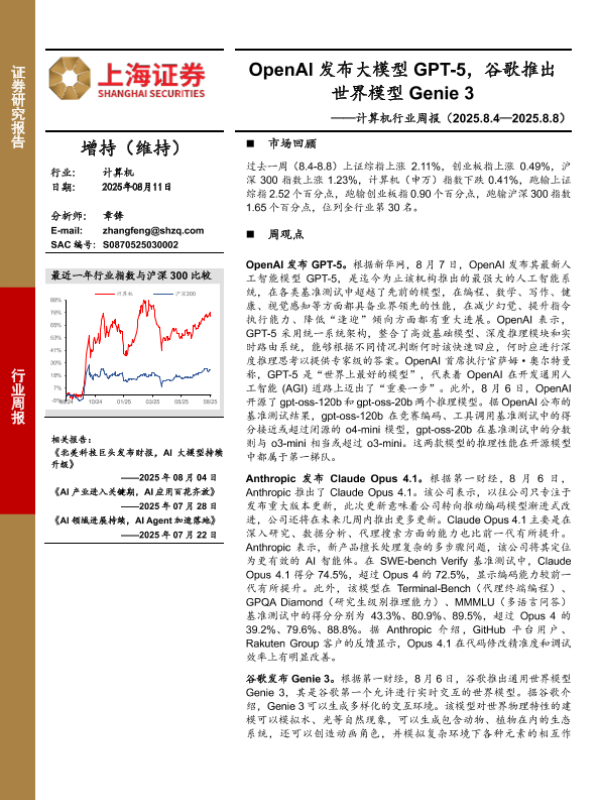 【上海证券】【20250811】计算机行业周报:OpenAI发布大模型GPT-5,谷歌推出世界模型Genie 3-3页 证券期货研究报告