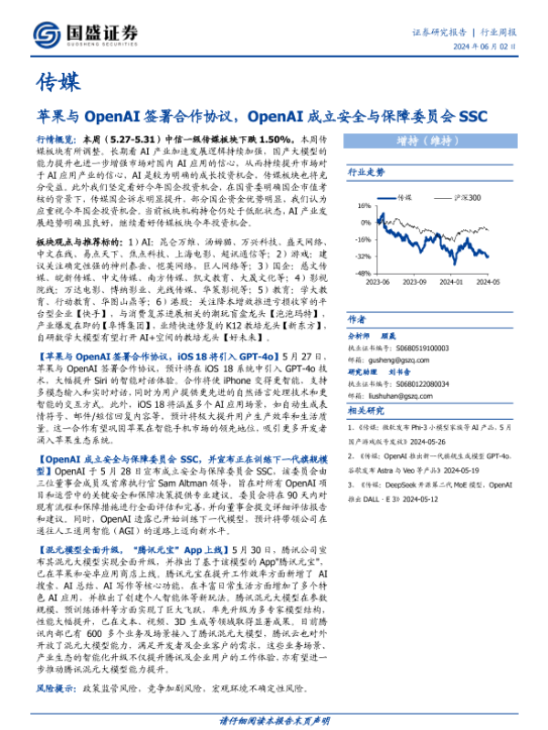 【国盛证券】【20240602】20240602-国盛证券-传媒行业周报:苹果与OpenAI签署合作协议,OpenAI成立安全与保障委员会SSC-10页 行业研究