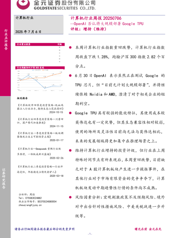 【金元证券】【20250706】计算机行业周报:OpenAI否认将大规模部署Google TPU-16页 证券期货研究报告